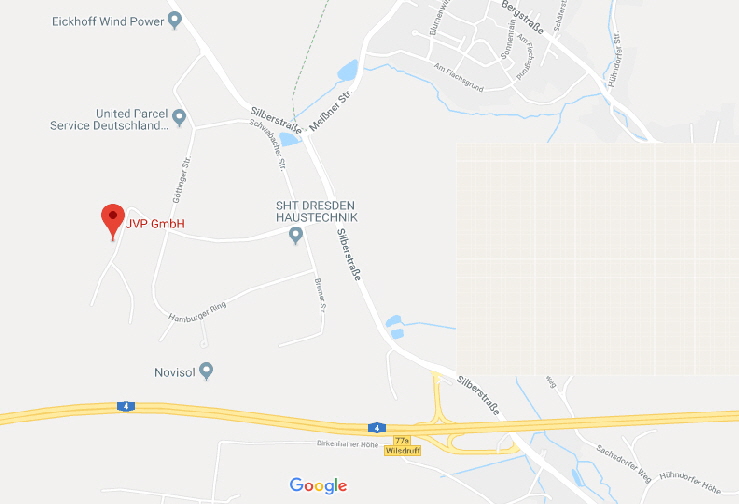 Die JvP GmbH liegt verkehrsgünstig in der Nähe von Dresden und den Autobahnknotenpunkten A4/A17 und A4/A14 . Nutzen Sie hier die Autobahnabfahrt A4 Wilsdruf und dann in Richtung Meißen.